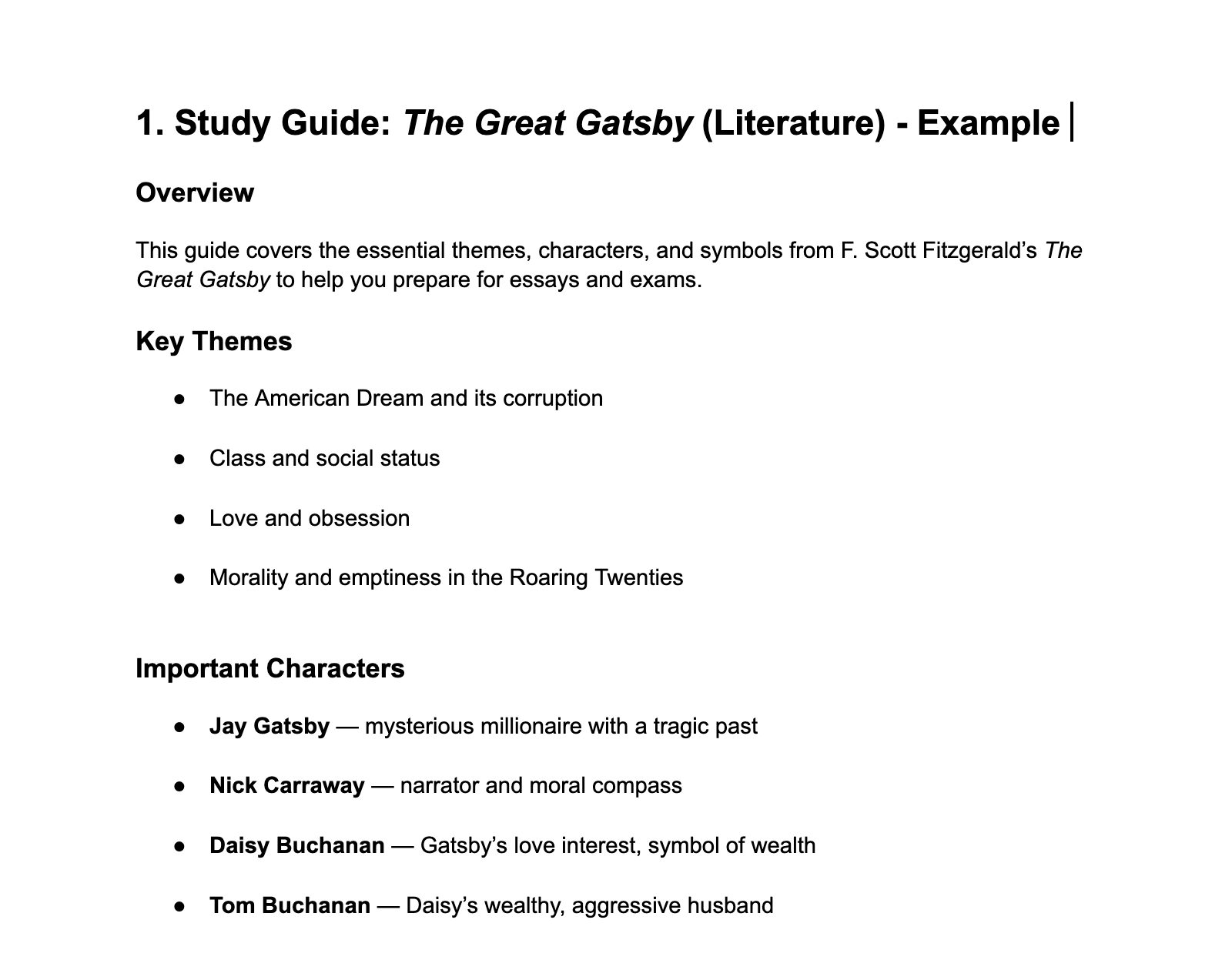 Get a personalized study guide tailored to your course. Fill out the form on the product page with your course details, topics, and exam date. Delivered in 48–72 hours as a PDF or Google Doc. NOTICE THIS STUDY GUIDE IS FOR LITERATURE ONLY - Books, Essays, Poetry, Plays, Non Fiction, Biographies & Autobiographies. Note study guides are bigger than the examples shown.
